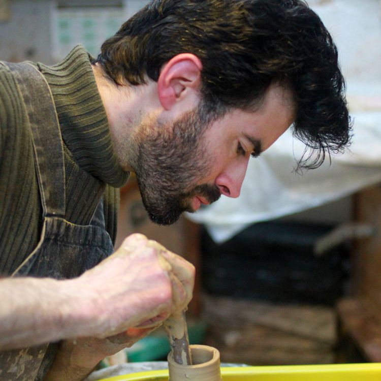 Jaroslav will be building a complete vessel with wheel-thrown sections and a hand-pulled handle.
