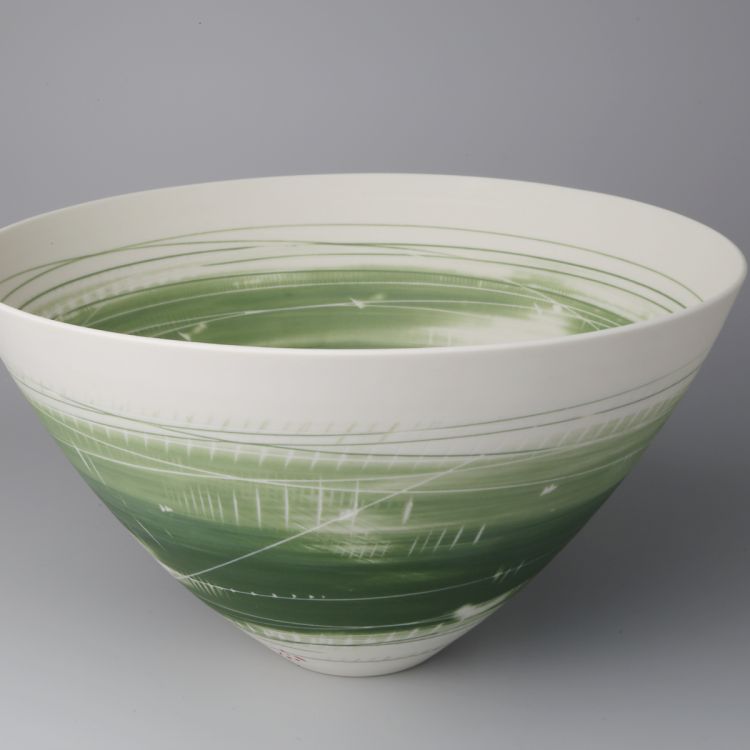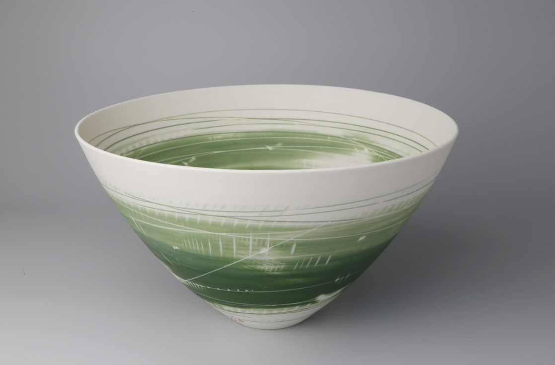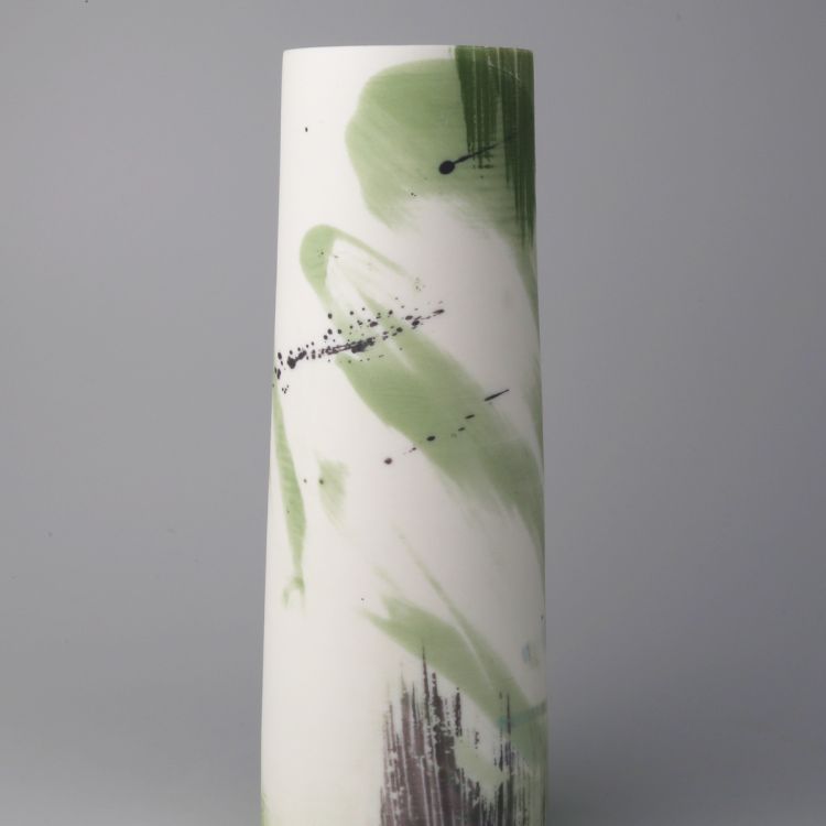 Ali’s work is a collection of thrown porcelain forms. She uses stains, oxides and slips, sponging and scraping colours and inlaying lines, working both on the wheel to capture a feeling of movement and experimenting with monoprinting and mark making techniques. Surfaces are unglazed, with a soft, matt surface.