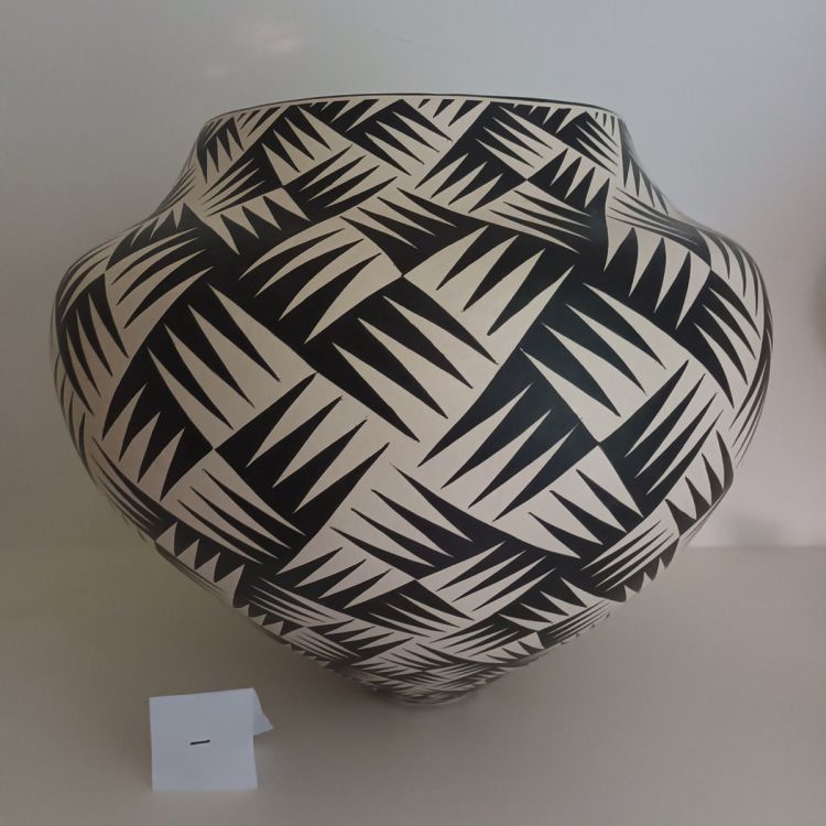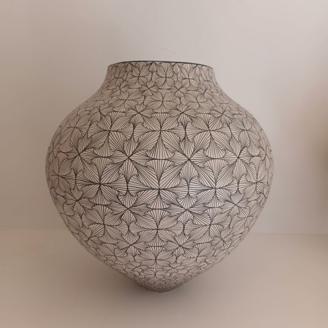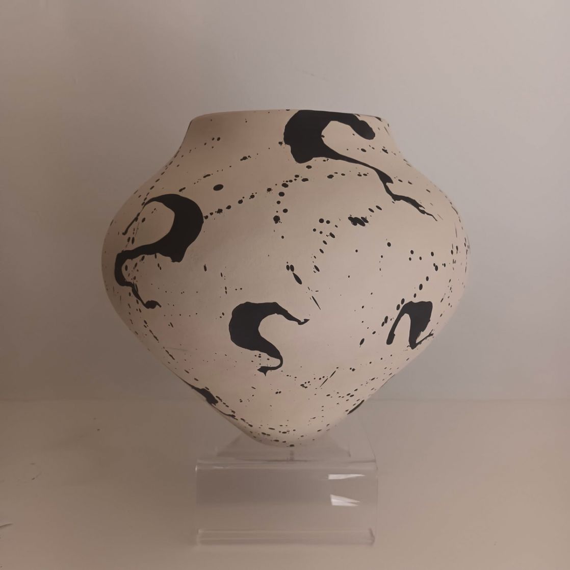 Vessels built using flattened coils of a mix of porcelain and Valentine GT Material. Slipped, burnished and low fired. Geometric designs are painted over the surface using a black glaze stain mixture and fired to 1200’C.