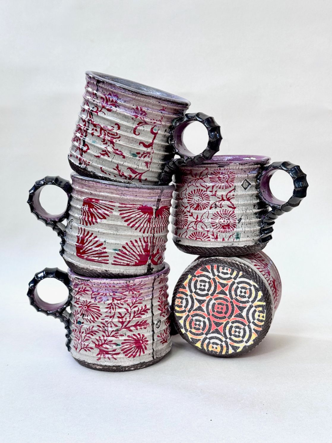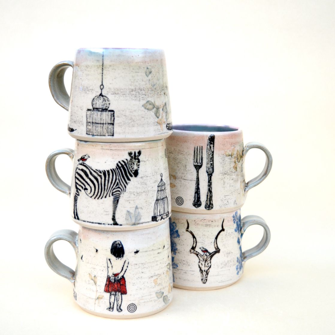 Asia gives her pots a slightly distressed look by applying different coloured slips, and decorating them with bespoke photocopied transfers and ready-made decals. Her unique trademark is inlaying bases of the pots with slips and underglazes.