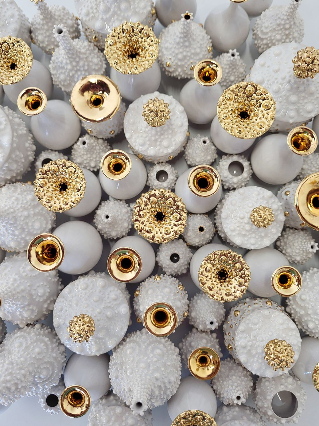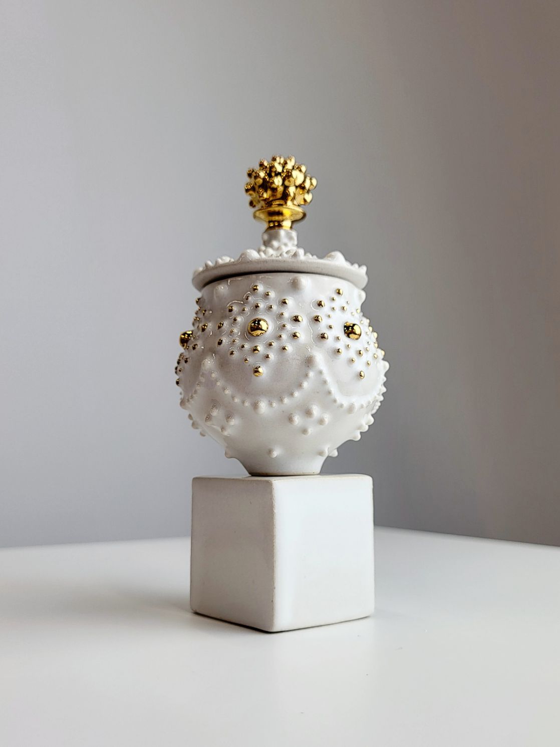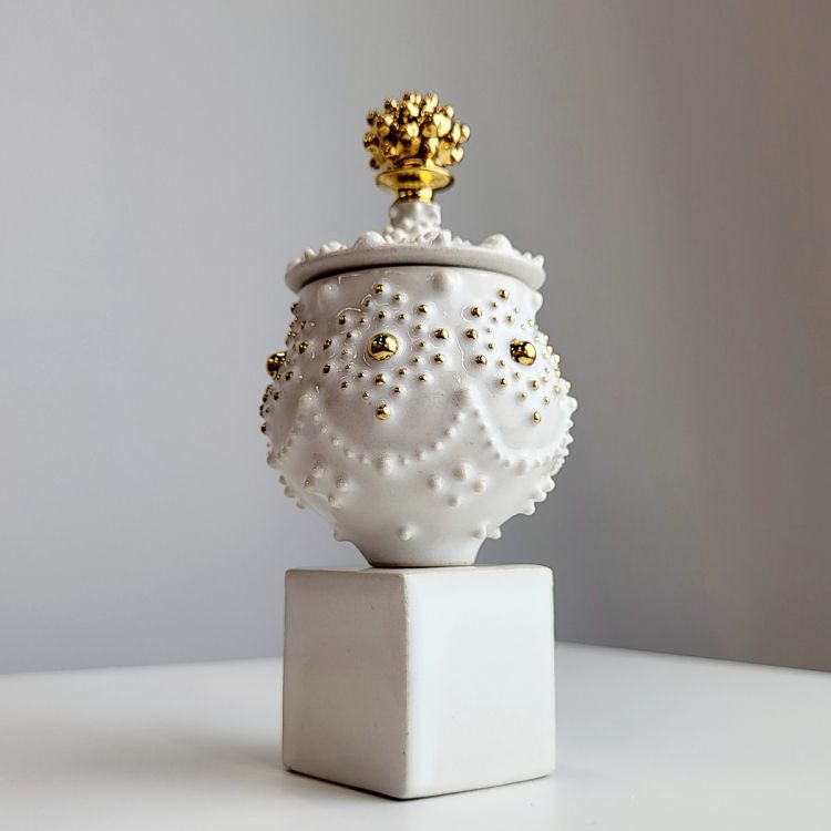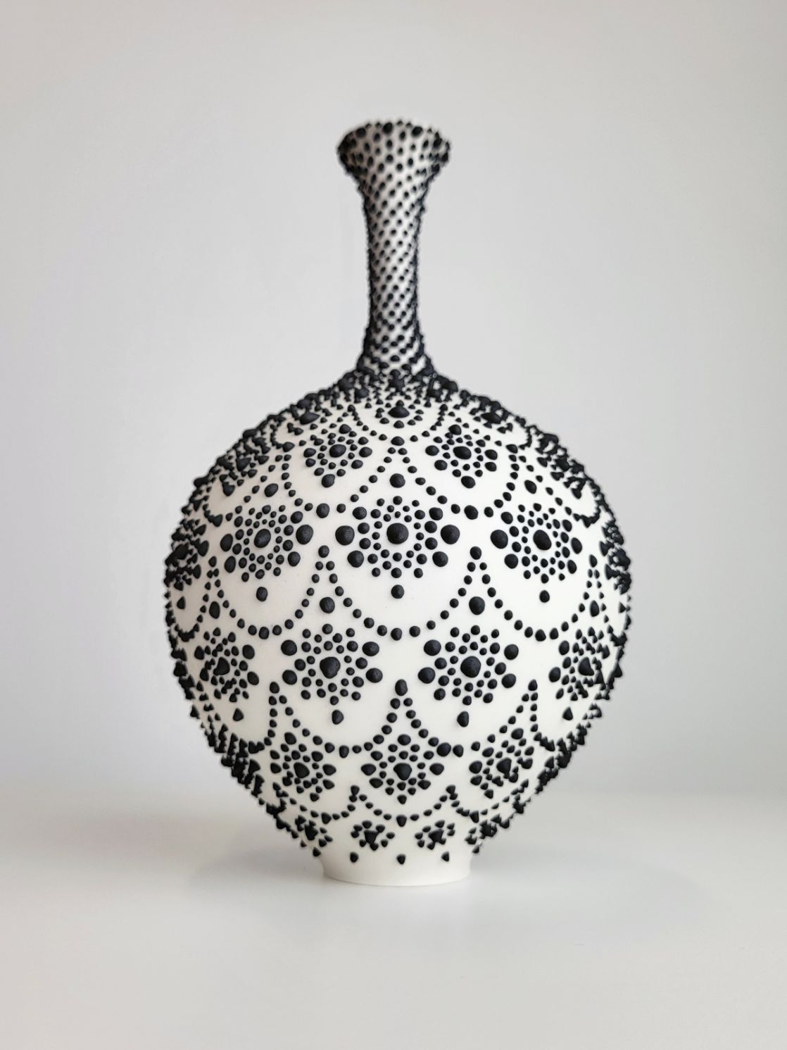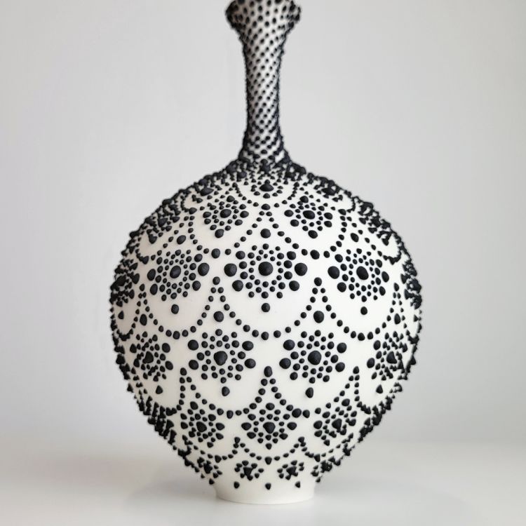 I create thrown vessels with porcelain or stoneware, and decorate using slip trailing, entirely freehand, to create symmetrical dotted patterns that span around the piece. I test and develop glaze recipes and apply lustres to accentuate the subtle surface texture. I aim to create sculptures that evoke a reaction in the viewer through their precision and ethereal appearance.