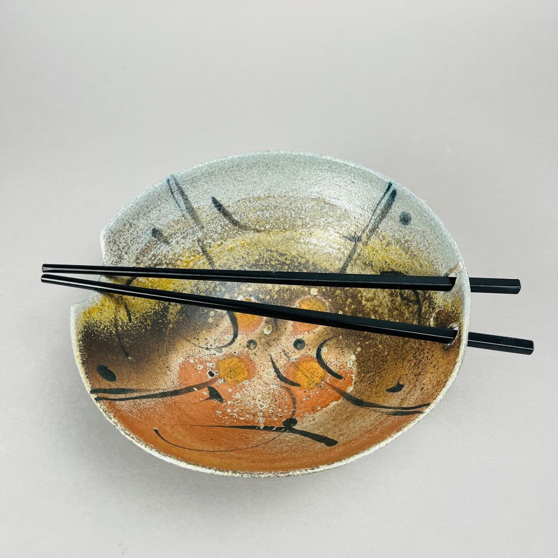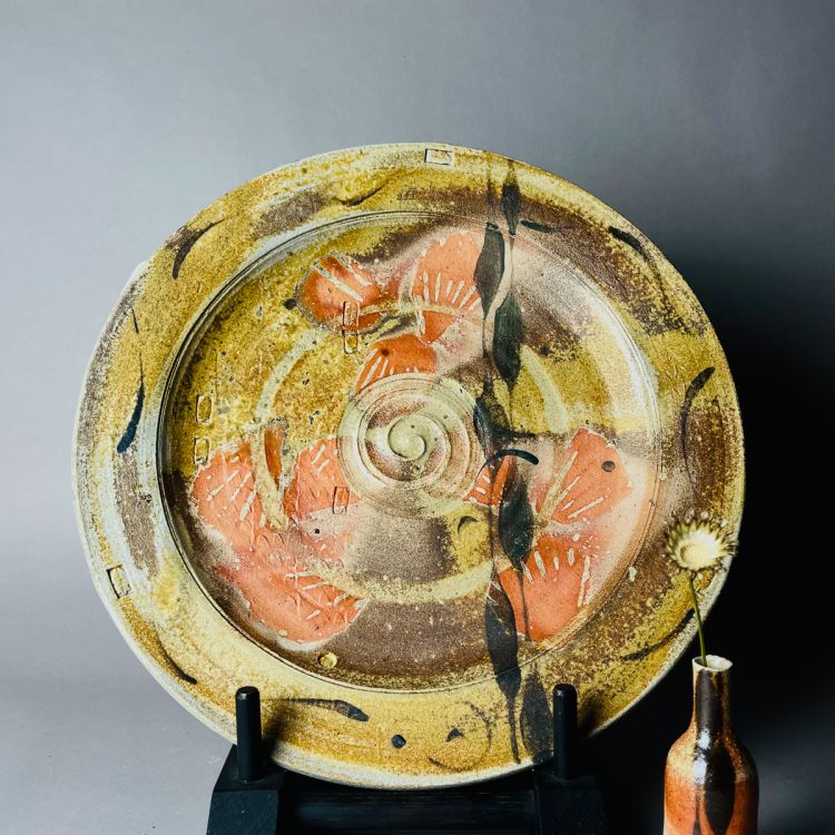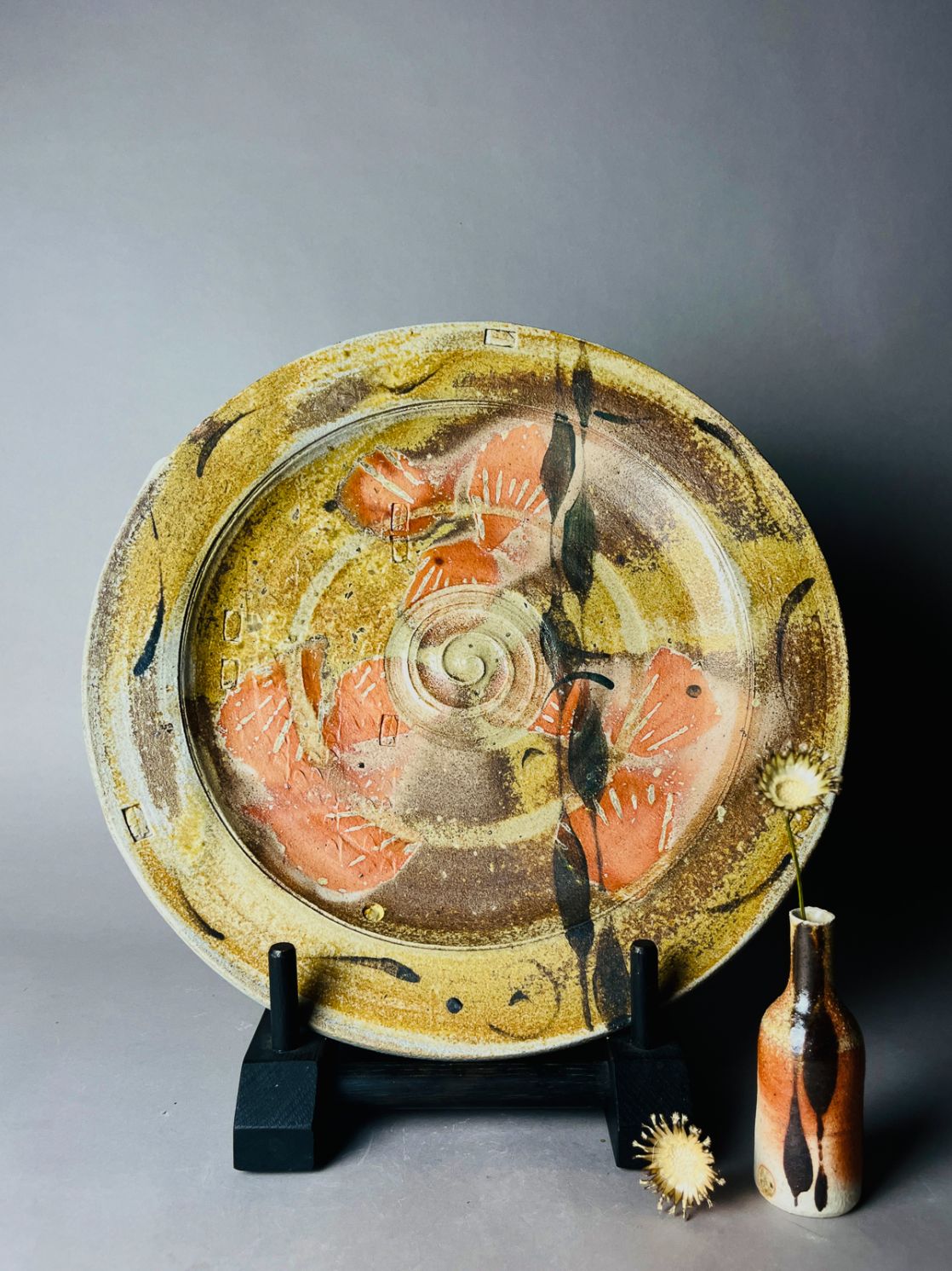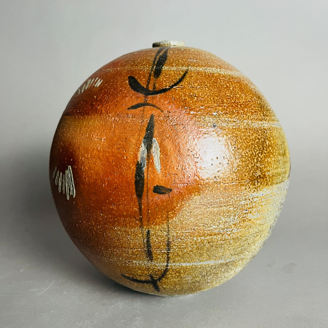 Thrown on the wheel and (sometimes) altered/faceted/impressed, the pots are slipped and wood fired in an anagama kiln for four days and nights. Glazed only on the inside, they are decorated by flame, fly ash and scallop shells. Also, sparingly, with calligraphic brushwork in a black slip. They range in size from shots (2″) to tall bottles (2′).
