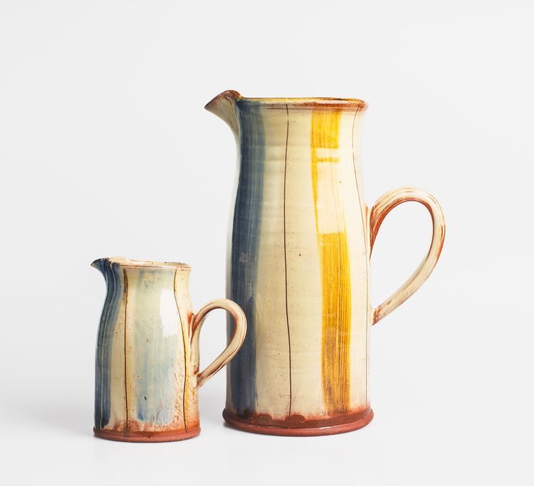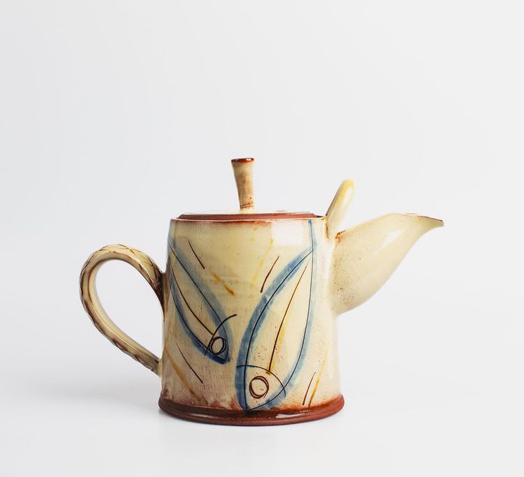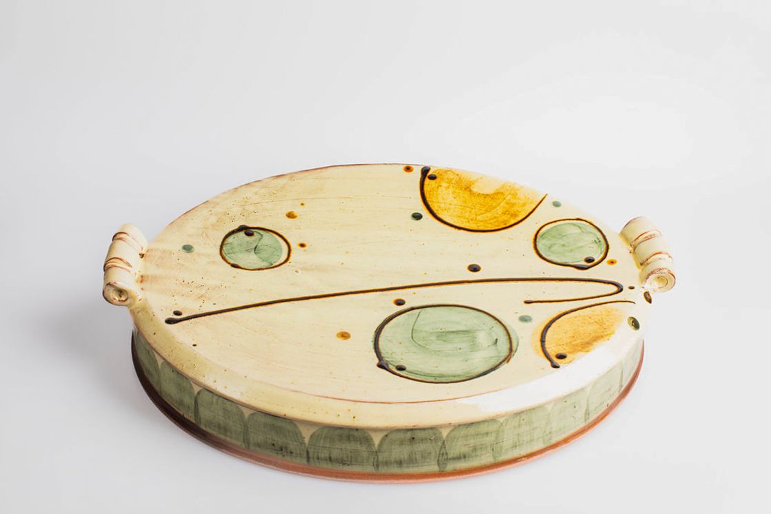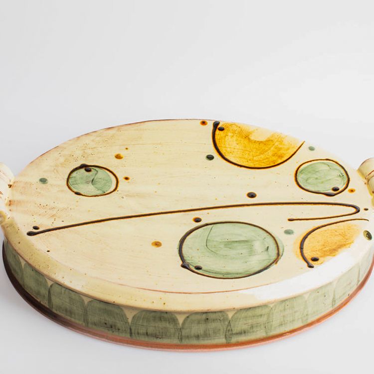 Jennifer’s oven and tableware is made using traditional slipware techniques to create lively, comforting pots for food and drink. Jennifer throws with red earthenware clay on a geared kickwheel. She decorates her functional pots with sgraffito, dipped, poured, brushed and trailed slips, with colour from cobalt and iron oxides