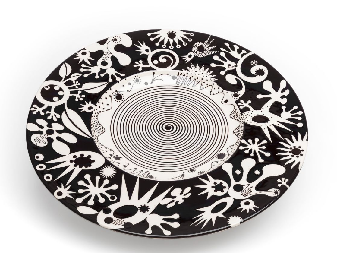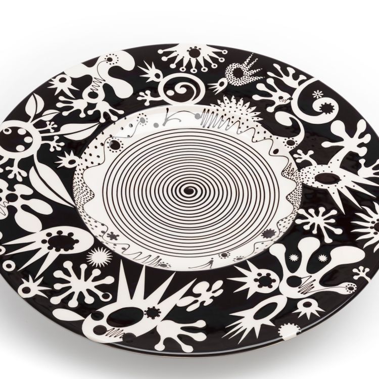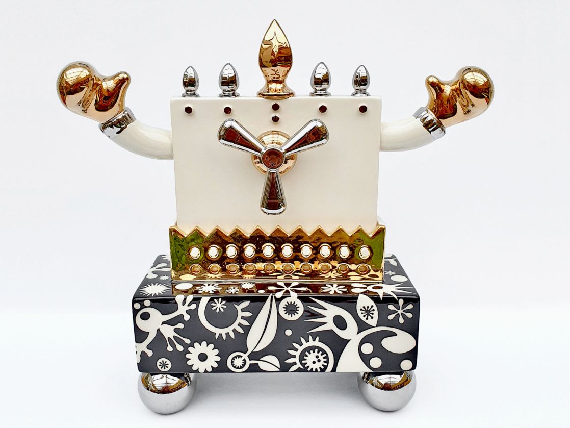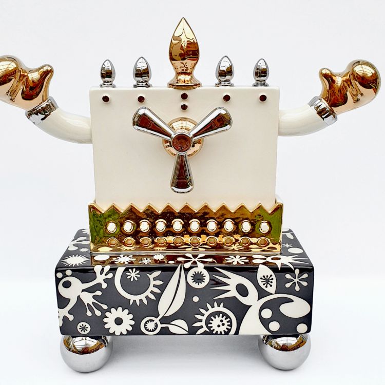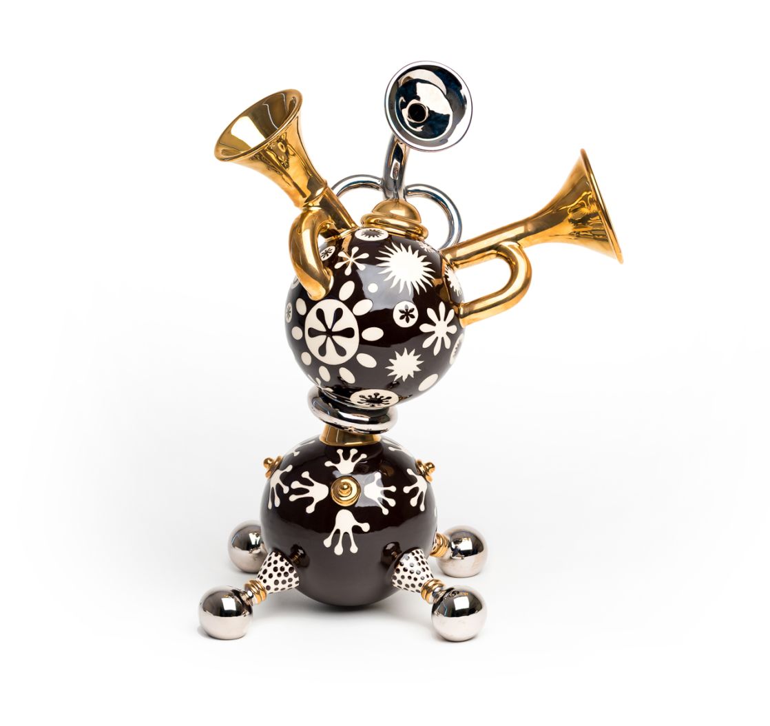 Bold and contemporary, monochrome ceramics, including teapots, mugs, jugs and bowls and some larger platters. Decorated with striking black and white, slip-trailed, brushed and paper resist stencils. Bright platinum lustre handles and knobs. Alongside slab built, funky, constructed ceramic sculptures, to entertain and amuse, with a dash of quirky humour.
