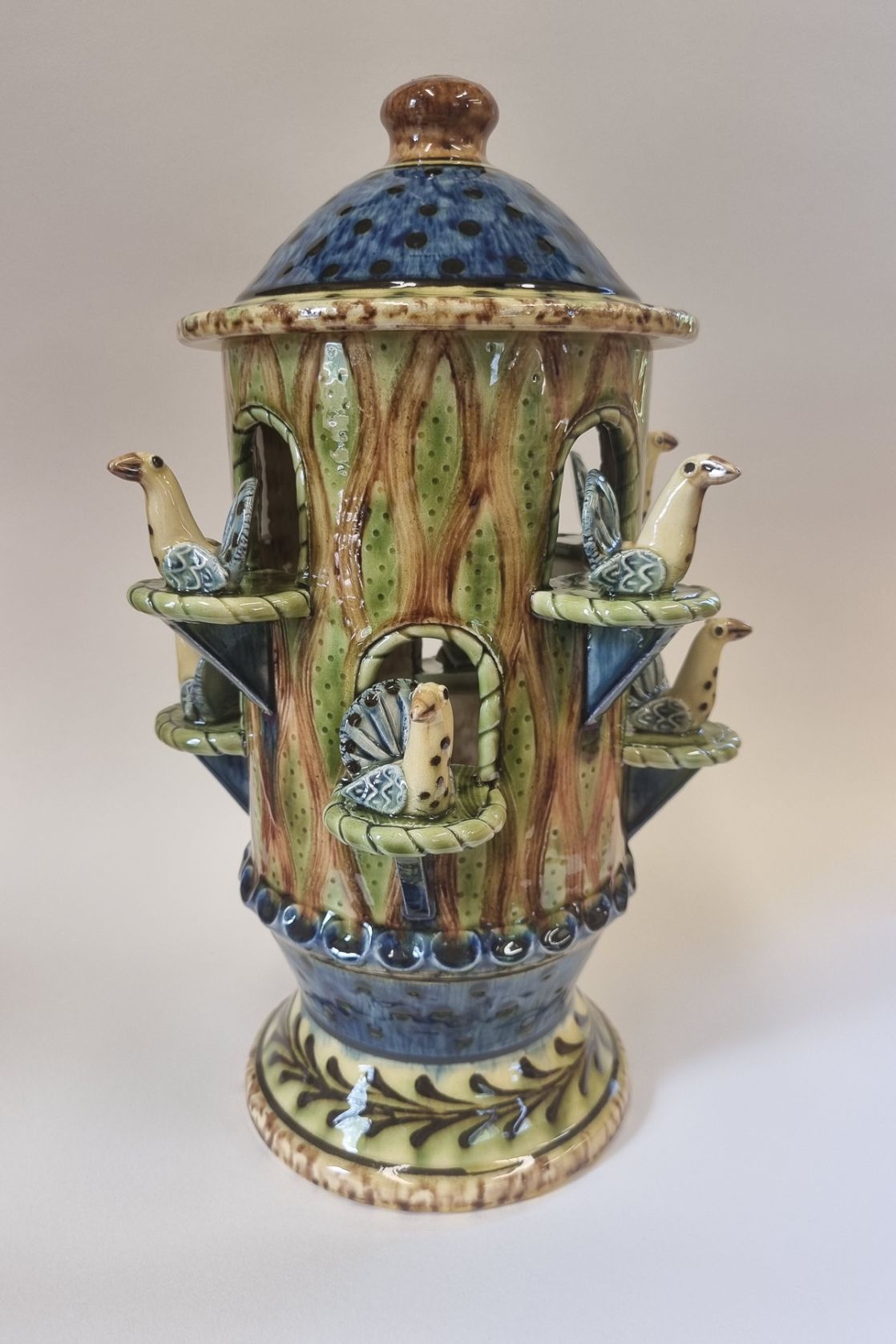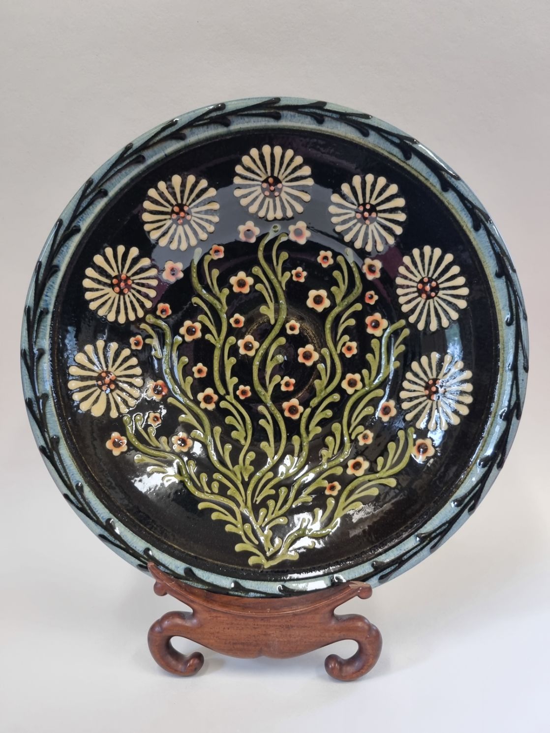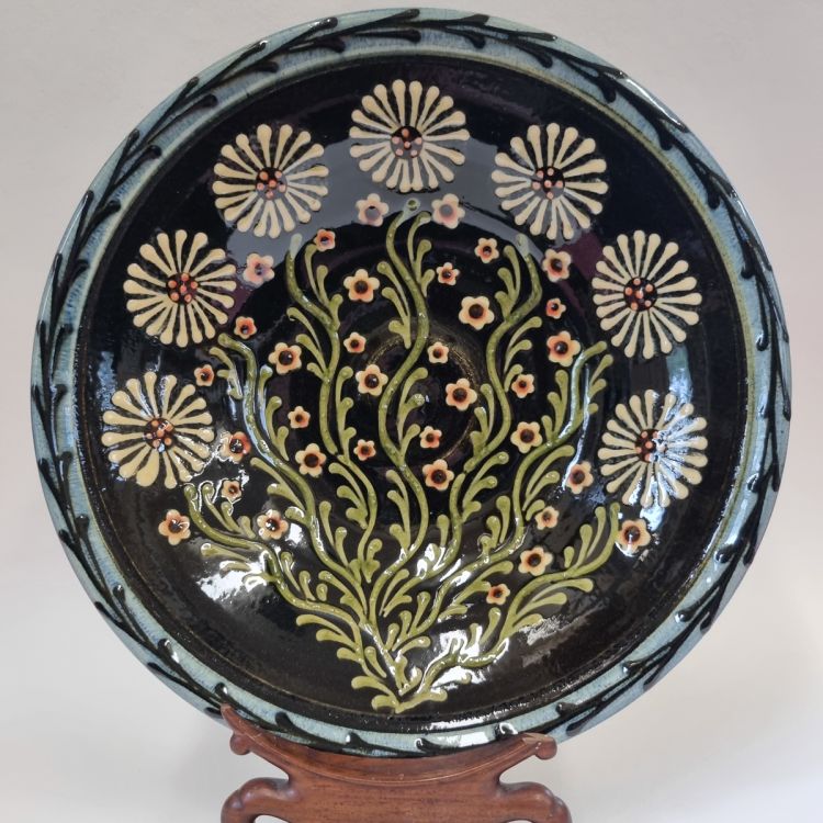I make a range of domestic and Decorative earthenwares inspired by the Glorious English and European Folk Arts traditions. Using combinations of throwing and handbuilding techniques to create, each piece is then adorned with slips and coloured glazes to add depth and surface colours.