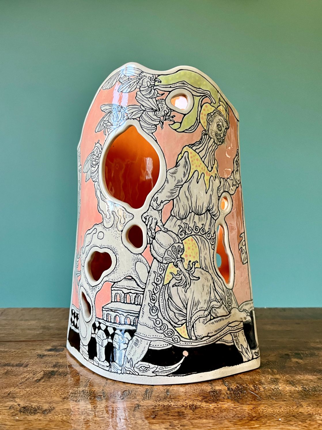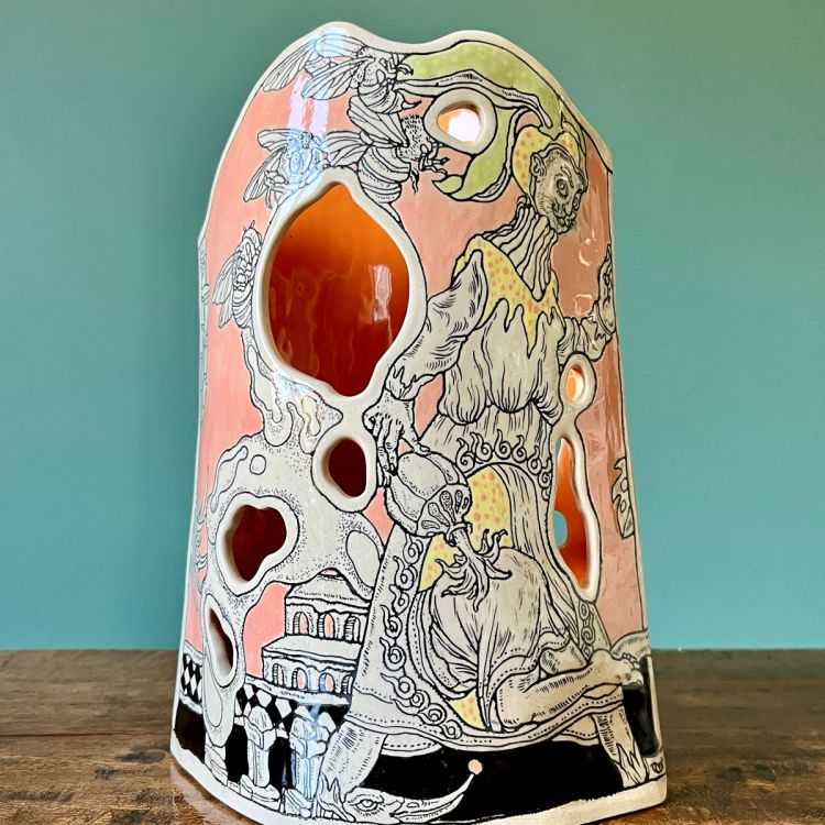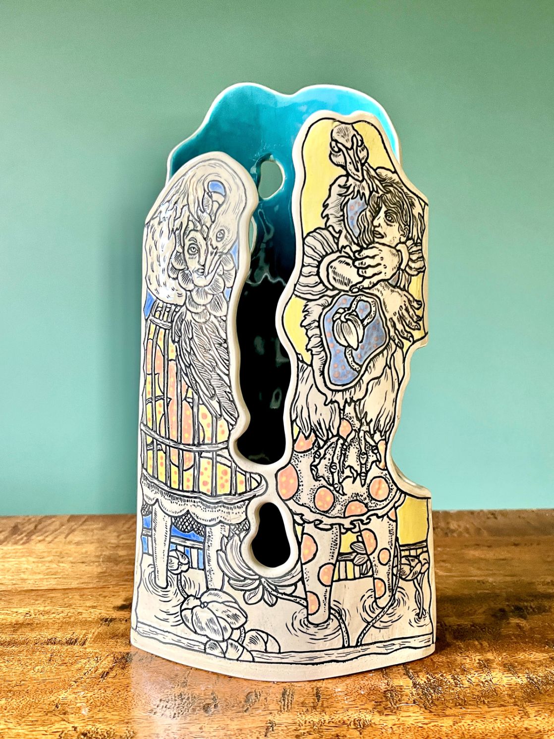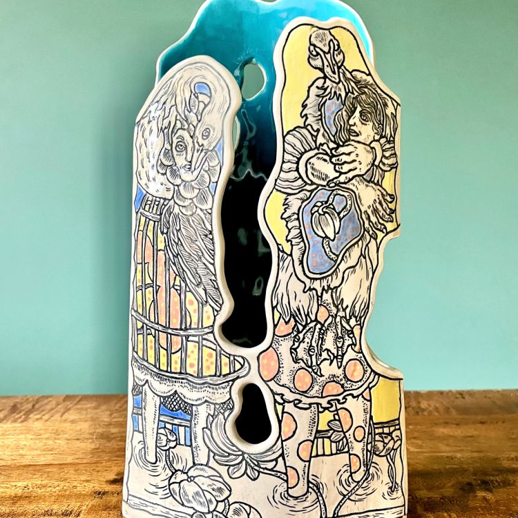 Qi Fang Colbert is a Northumberland based ceramicist, artist and PhD Fine Art graduate specialising in hand-built and thrown stoneware forms. All of Qi’s works are free hand carved with highly detailed original illustrated narratives that are inlaid with slip and hand painted with underglazes. Her organic-shaped works explore the relationship and interaction between humans and our natural world and are inspired by real life observations and imagined narratives that Qi develops through a stream of consciousness drawing process.